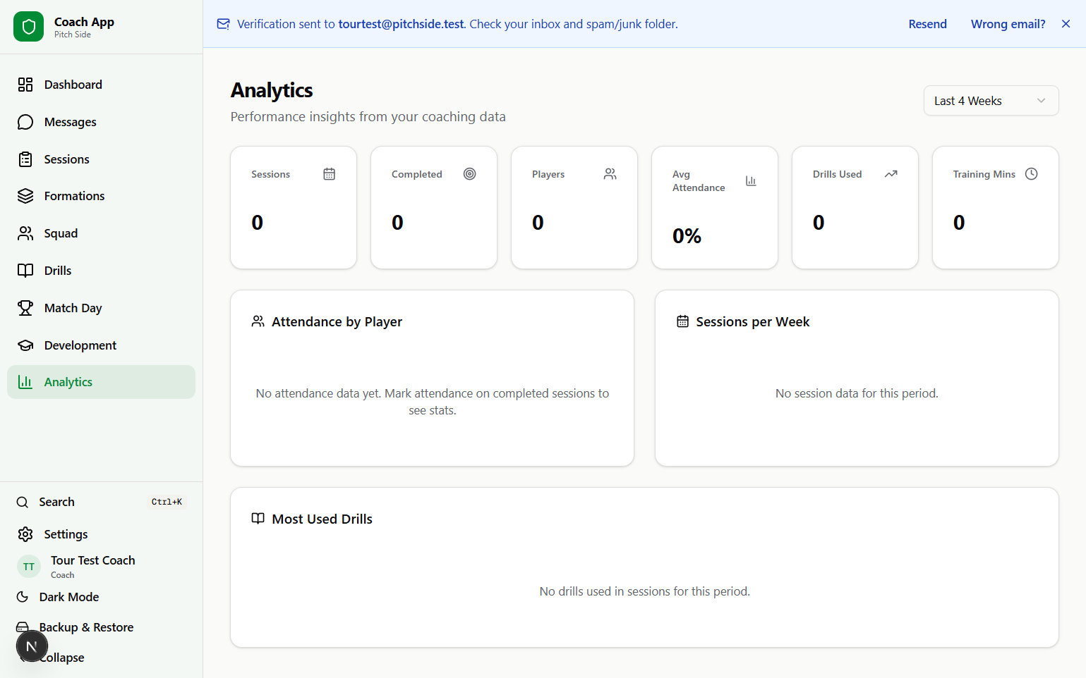 Simple charts that show you attendance patterns, which drills you've been using, how often you're training, and what's changed over time. It's not about stats for stats' sake — it's about spotting things like 'we haven't done much defending work lately' or 'attendance dips after half-term'. Export reports if your club asks for them.