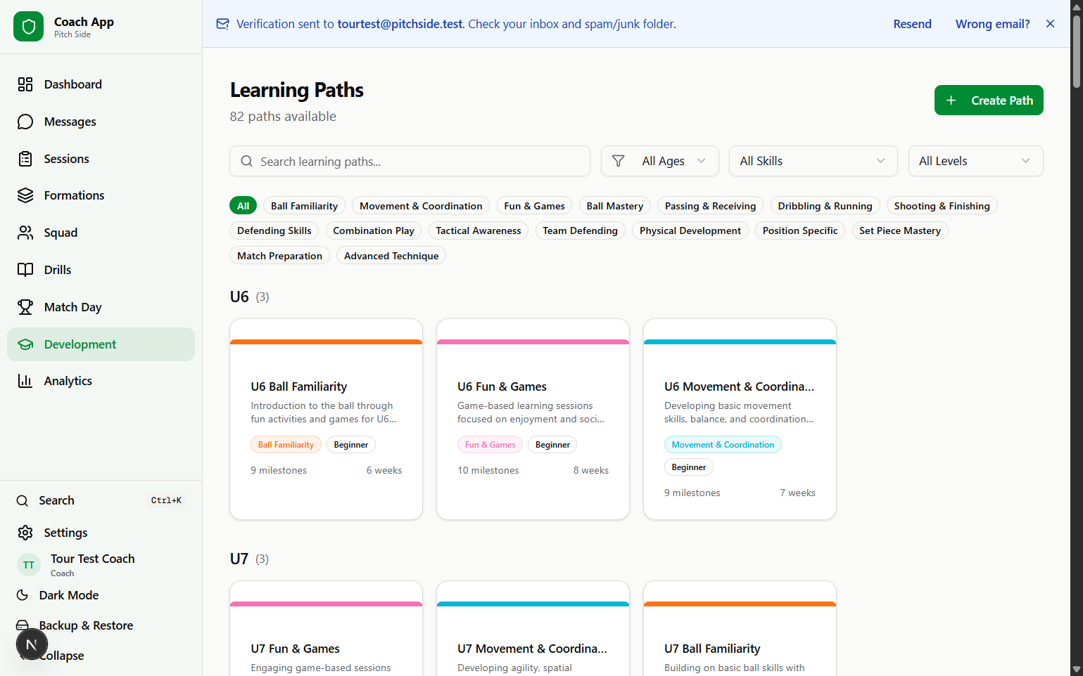 Follow age-appropriate skill progressions designed for grassroots football. Whether your players are U5s learning to dribble or U18s working on tactical awareness, development paths help you coach the right things at the right stage. Track individual progress with notes and milestones so you can see how far they've come.