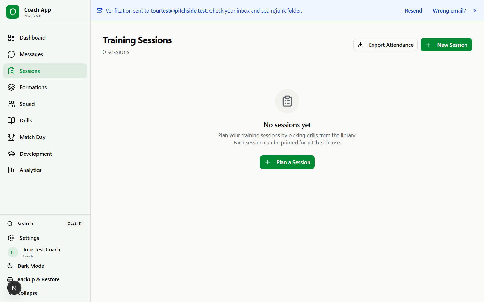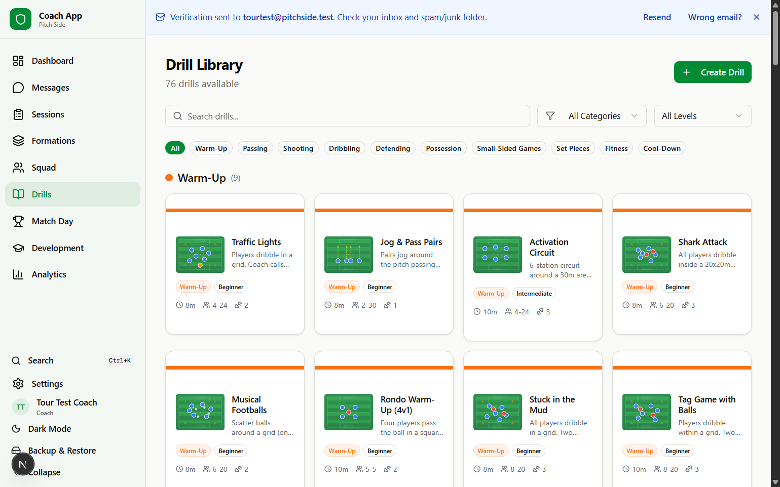 We've all been there — standing in the car park five minutes before training trying to remember what you planned. With the session planner, you can build sessions during the week using drag-and-drop. Add warm-ups, drills, small-sided games, and cool-downs with timings and coaching points. See your schedule in a calendar or list view, and print plans to bring to the pitch.