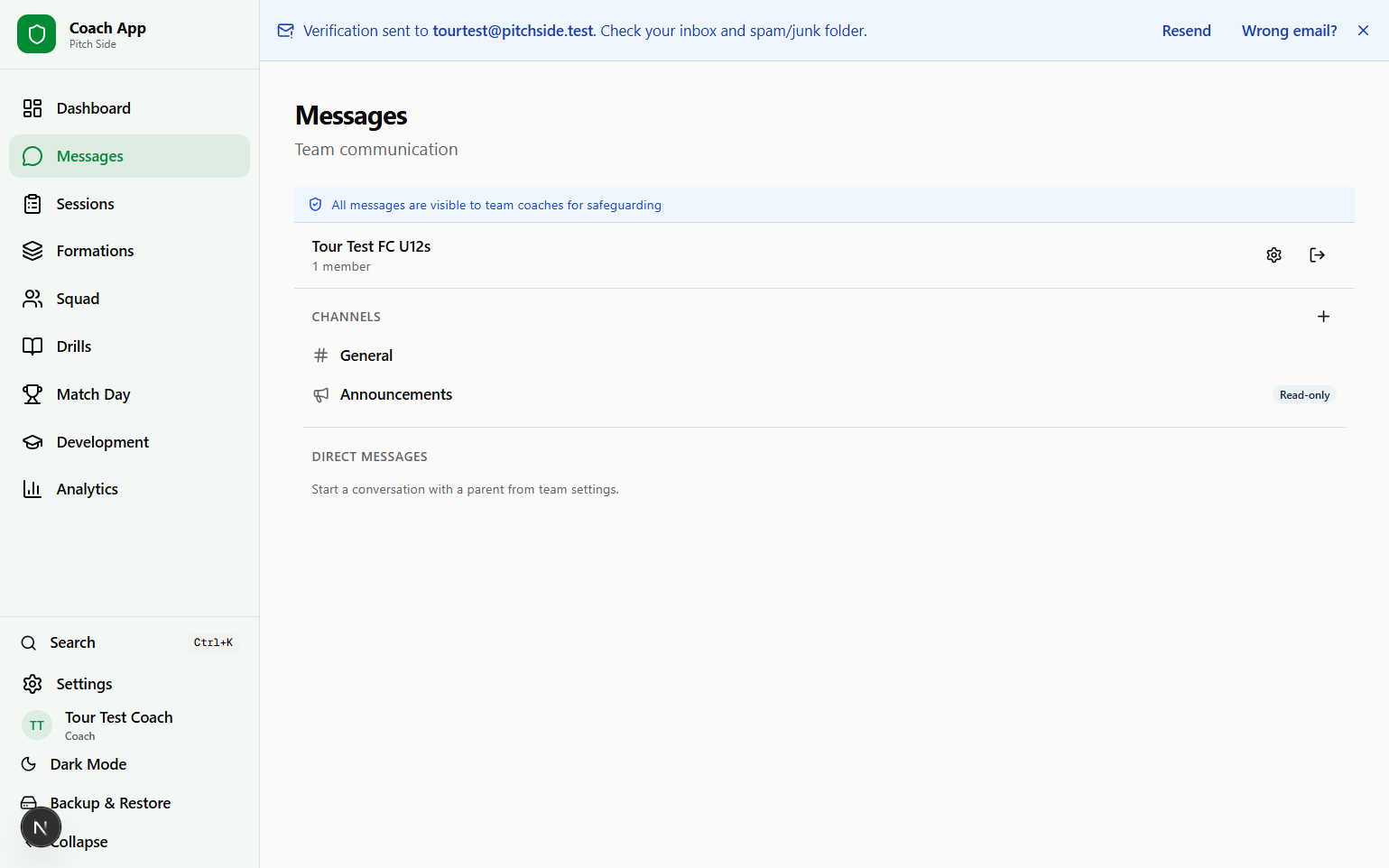 Post announcements about upcoming matches, training changes, or kit reminders in the team channel. Parents, coaches, and team managers can all see what's happening without needing yet another group chat. One place for team communication, built right into the app.